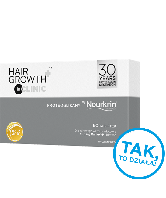 Działanie Hair Growth+ inCLINIC® jest udowodnione naukowo – czytaj więcej*Thom E. Nourkrin®: Objective and Subjective Effects and Tolerability in Persons with Hair Loss.J Int Med Res. 2006;34(5):514-9. **Kingsley D, Thom E. Cosmetic hair treatments improve quality of life in women with female pattern hair loss. J Appl Cosmetol. 2012;30:49-59. ***Pamiętaj, że indywidualne wyniki mogą się od siebie różnić. ****Produkt jest suplementem diety. Nie stosować w przypadku alergii na ryby. Nie należy przekraczać dziennej porcji spożycia. Suplement diety nie może być stosowany jako substytut (zamiennik) zróżnicowanej diety. Przechowywać z dala od dzieci. Kobiety w ciąży lub karmiące piersią przed spożyciem produktu powinny się skonsultować z lekarzem.